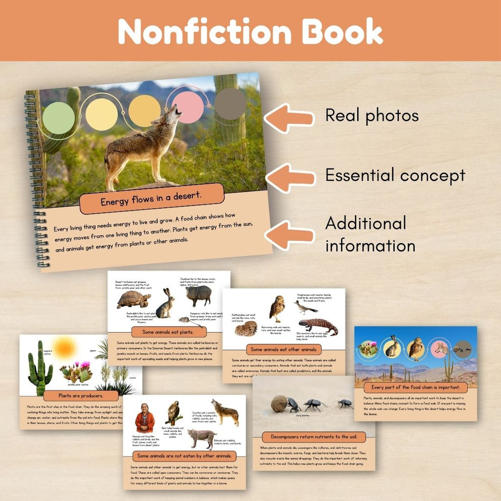 Use this set to support your desert biome work. Students will explore how energy moves through the Sonoran Desert and how organisms depend on one another. Students will build food chains, sort organisms by diet and trophic level, and visualize the flow of energy through the ecosystem.