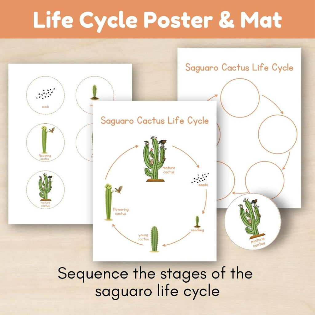 • Full-color poster (8.5 × 11") showing the stages: seed, seedling, young cactus, flowering cactus, and mature cactus