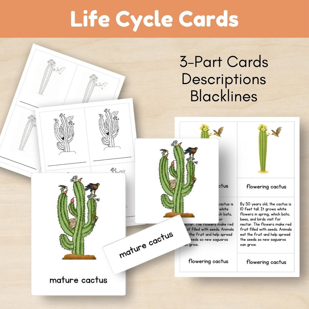 • 3-part cards for cactus features: stem, arms, spines, flowers, fruit, and roots