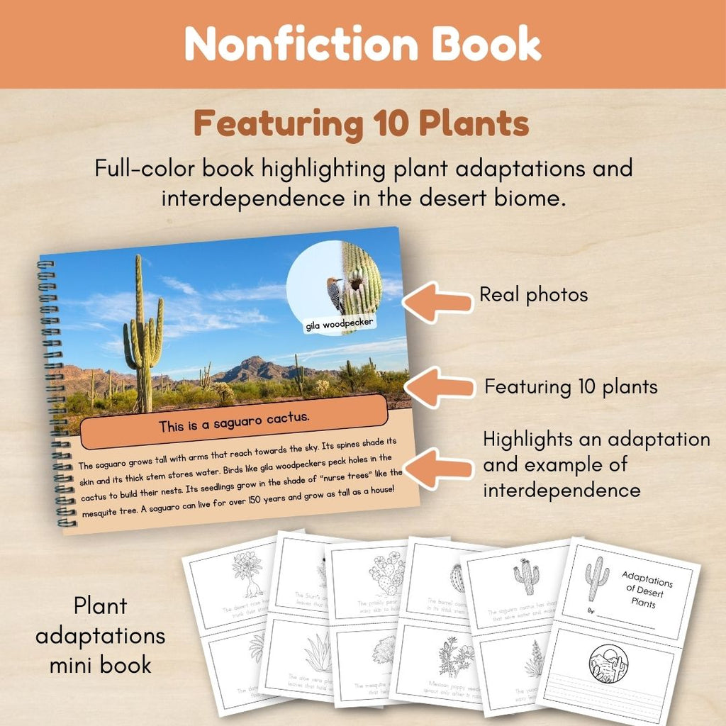 This Desert Plants Mini Unit helps students explore plants in the desert habitat through real photographs, simple nonfiction text, and hands-on learning activities. Children learn how plants live in the desert biome, how they are adapted to hot and dry environments, and how plants depend on nonliving things, animals, and other plants to meet their needs.