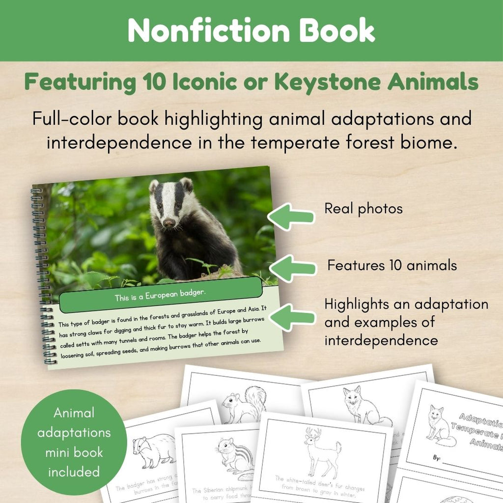 This Temperate Forest Animals Mini Unit helps students explore animals in the temperate forest habitat through real photographs, simple nonfiction text, and hands-on learning activities. Children learn how animals live in the temperate forest habitat, how they are adapted to cool environments with changing seasons, and how animals depend on plants, nonliving things, and other animals to meet their needs.